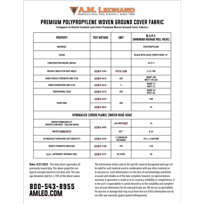 Heavy Duty 3.2oz Black Woven Polypropylene Ground Cover fabric controls weeds and grass in container fields, greenhouses, and landscapes. It provides superior puncture and tear resistance, yet allows air, water, and nutrients to pass through, making it ideal for field production or landscapes with plants. This ground cover conserves water and is approved for government weed control applications. Gold stripes spaced every 1ft aid in plant layout and organization. It’s formulated to resist UV degradation and adheres to industry-standard UV stability. The GC103 10ft x 300ft rolls are now folded to half the width for cost-effective freight. Ship wt. 76lb.