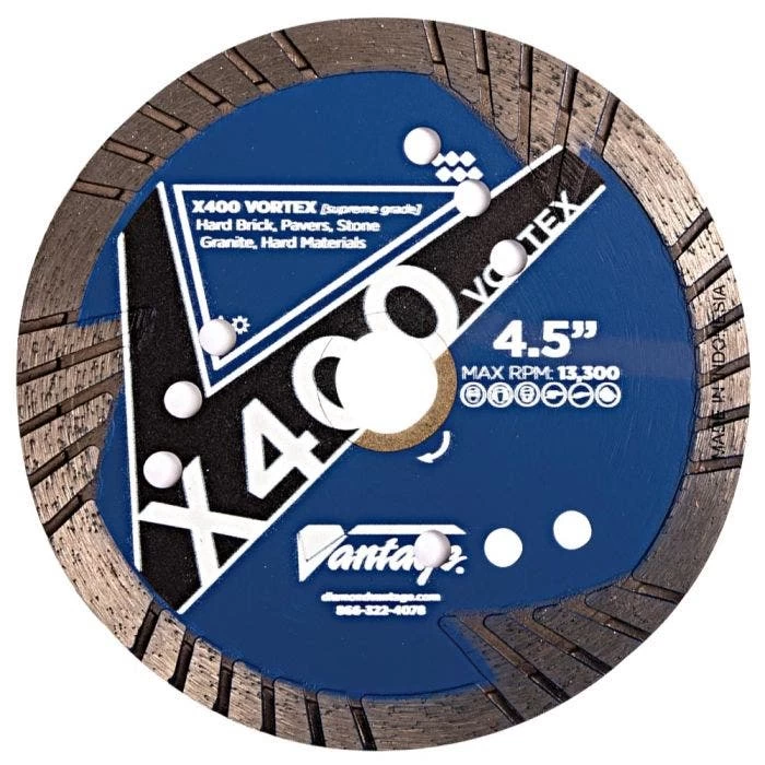 Diamond Vantage designed their X400 Vortex Blade to handle a wide variety of tile and stone materials currently trending in the hardscape industry. These supreme quality diamond blades will cut a wide variety of hard materials. From porcelain and granite tile and natural stones, to standard concrete products like pavers, brick and block. The X400 also makes a good demolition blade and can be used to cut old, hard concrete and reinforced concrete. It features a continuous, 9mm turbo rim height for extended blade life. Its ventilated steel core offers superior cooling. And these blades can be used for both wet and dry cutting applications.