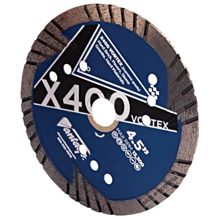 The X400 Vortex Blade can cut a wide variety of hard materials, including porcelain, granite tile, natural stones, pavers, brick, and block. It can also be used to cut old, hard concrete and reinforced concrete.