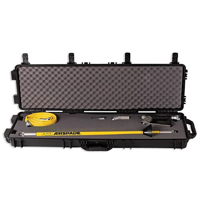 The kit includes an AirSpade 2000 handle with Chicago style connectors, a 4-foot fiberglass barrel with a dirt shield, a 45-degree angled adapter, a stainless steel supersonic nozzle, a lightweight air hose with Chicago style connectors, and a heavy-duty locking storage case.