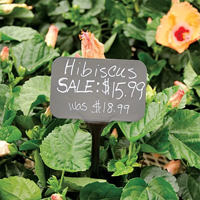 Large face for greater visibility. Use washable color markers to make your signs ‘jump-out’ on the black background. Create eye-catching product descriptions, planting tips, prices, etc. Rustproof, waterproof and won’t turn yellow. Insert stake in the ground, in a container or pot, or mount on a bench. Optional base allows your sign to be free-standing. Sold 25 per case.