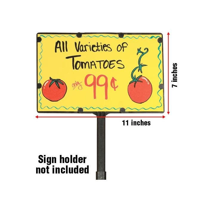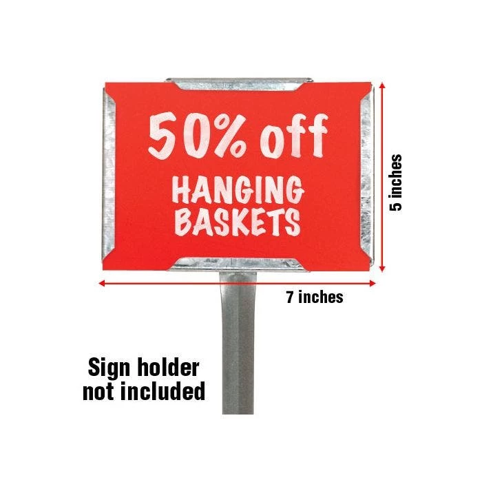 These vinyl sign cards are 0.015-inches thick and come in two different sizes. The N5014 is 7-inches x 5-inches and the N5018 is 11-inches x 7-inches. Available in Red (1R), Yellow (4Y), Orange (5O). Pack of 25.