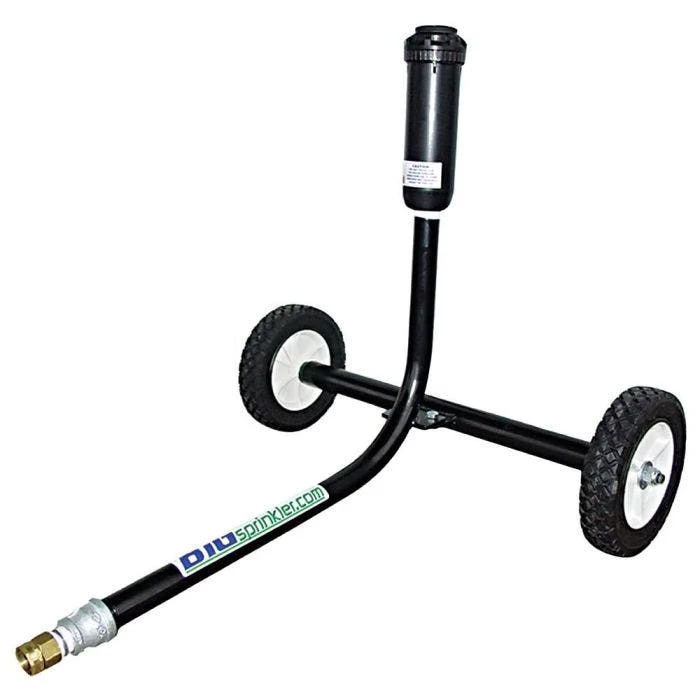 The 1000R heavy duty wheeled sprinkler cart comes with Falcon Gear Drive Rotor Sprinkler Technology!! This smooth and quiet rotor drive sprinkler features an even water pattern with a gentle rain curtain, interchangeable nozzles, and “leak free” seals to avoid puddling at the sprinkler. It works well at low pressures and is a excellent tool for watering, with both residential and and commercial uses. Also works great for horse arena dust suppression because of it’s leak free wiper seal avoids puddling at the head. The 1000R Heavy Duty Sprinkler Cart with wheels is constructed of 1? heavy gauge steel pipe, a solid 1.5″” steel axle for weight, and a durable “baked on” powder coat finish. With the Falcon rotor, you can have it all — uncompromising performance, superior distribution, reliability and durability. Rain Curtainâ„¢; nozzles maximize performance and coverage. A multi-function wiper seal and tapered riser keep the stem clear of debris, providing long-term protection. Plus, heavy-duty construction makes this rotor one of the toughest in the field. Spray distances up to 120 feet in diameter! This sprinkler will maximize your potential and is the largest you can operate from a standard faucet and 3/4″” garden hose. Portable stand sprinkler carts are a great alternative to other irrigation systems when a lower cost option is needed. Simply place the sprinkler in the area to be watered, complete the application in the desired time, then pull the sprinkler ahead to the next dry area to be watered! Want to move even more water? Use our new BIRD1-50 or BIRD1-100, the first 1″” hose with regular 3/4″” Garden Hose Fittings, it moves 30% more water than the same length 3/4″” hose! Quality Made in the USA!!