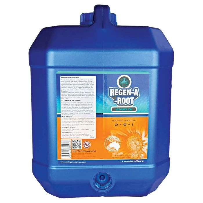 CX Horticulture Regen a Root is a root growth tonic that stimulates massive and healthy root growth without any growth hormones. It contains auxin precursors that encourage maximum nutrient uptake during all phases of growth and bloom, and boosts root immune defenses while not inhibiting top growth.