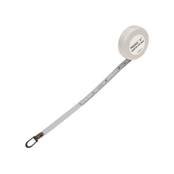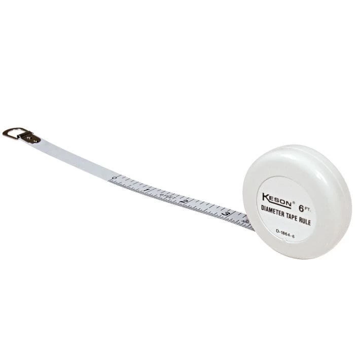Measures up to 23-inch diameter in 64ths. 6-foot x 3/8-inch blade. Plastic case approximately 1 7/8-inch diameter, 5/8-inch thick.