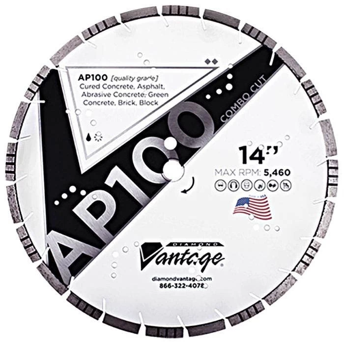 The Diamond Vantage 14 Combo Cut Diamond Blade is designed to cut abrasive materials such as asphalt, green concrete, cured concrete, brick, and block.