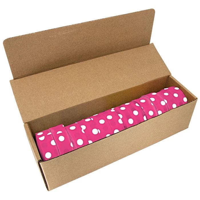 - Box contains 12 rolls of white/glo pink polka dot tape