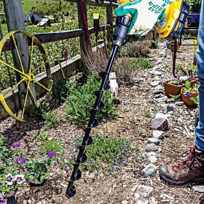The 224HD Power Planter is the professional landscapers choice for dramatically increasing efficiency when planting grass plugs, 4 &6 pack annuals, or deep feeding and aerating trees and shrubs. The added heavy duty tip is excellent for those less than desirable soils (heavy clay and loose rock).The 24″ length eliminates bending. 2″ diameter X 24″ length, and 18″ of thick durable 10 gauge flighting, painted glossy black. 18V or greater with 1/2″ drive drill needed. 100% Made in the USA!
