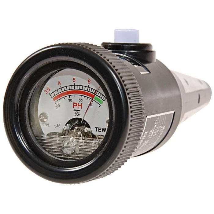 Push button switch for measuring pH ranges from 3.5 to 8. Can be calibrated to maintain accuracy. Also measures soil moisture. Accuracy +/- .2 pH in acidic soils. Not designed for alkaline soils of 7.5+ pH or greater. Case included, 6 1/2in. long.