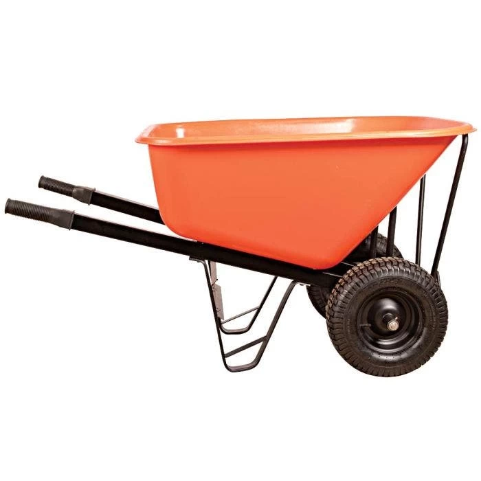 Use this wheelbarrow for the biggest jobs. Its 750-pound capacity allows you to move even the heaviest loads! Design: We designed this wheelbarrow to haul large loads. The two-wheel design, along with the additional front bracing, ensures that this wheelbarrow will hold the weight. The 10-cubic-foot capacity poly tray provides a large amount of space. The improved tray brace design allows for better tray support of even the heaviest loads. Steel Handles: We equipped this wheelbarrow with our NEW steel handles.