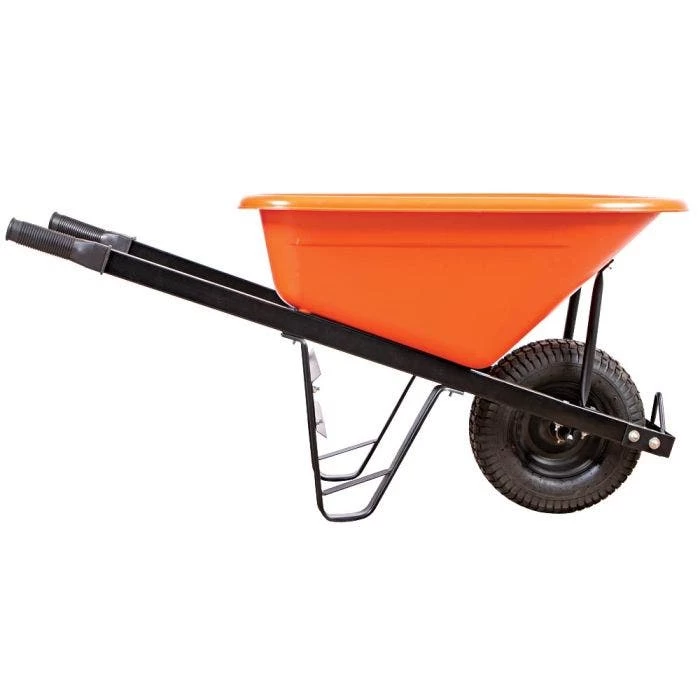 We design our wheelbarrows with you in mind! We loaded these wheelbarrows with features: Design: The low-profile design provides increased stability, even with heavy loads on rutted surfaces. Wide carriage bolt heads and heavy-duty undercarriage offer enough support to handle loads weighing up to 500-pounds. The tough, 6-cubic-foot capacity poly tub provides many years of reliable service! Steel Handles: We equipped this wheelbarrow with our NEW steel handles. We make these handles from 18-gauge galvanized steel tubes.