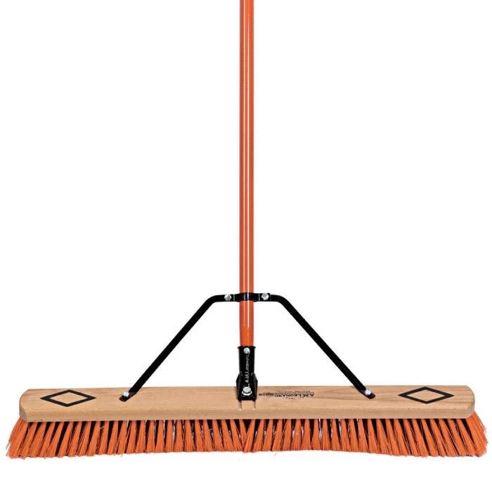 Leonard Dual-Bristle Push Brooms combine two bristle types in one exceptional broom. The center of the 30-inch wide block features medium-stiffness bristles while the border consists of fine bristles. We make the bristles using a synthetic material. The clear-coated hardwood block has a slotted, bolt-through connection. We finish off this tool with a 1-inch diameter, 60-inch long steel handle. Powder-coated steel braces add strength to the handle connection.