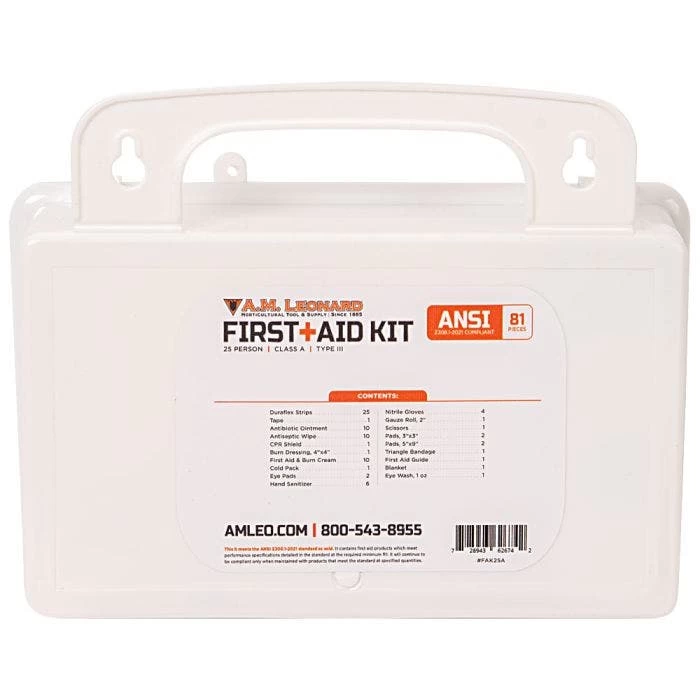 The Leonard First Aid Kits contain all the required items from ANSI z308.1 2021, including Duraflex Strips (25), Tape (1), Antibiotic Ointment (10), Antiseptic Wipe (10), CPR Shield (1), Burn Dressing, 4 x 4 (1), First Aid & Burn Cream (10), Cold Pack (1), Eye Pads (2), Hand Sanitizer (6), Nitrile Gloves (4), Gauze Roll, 2 Inches (1), Scissors (1), Pads, 3 x 3 (2), Pads, 5 x 9 (2), Triangle Bandage (1), English/Spanish First Aid Guide (1), Blanket (1), and Eye Wash, 1 Ounce (1).
