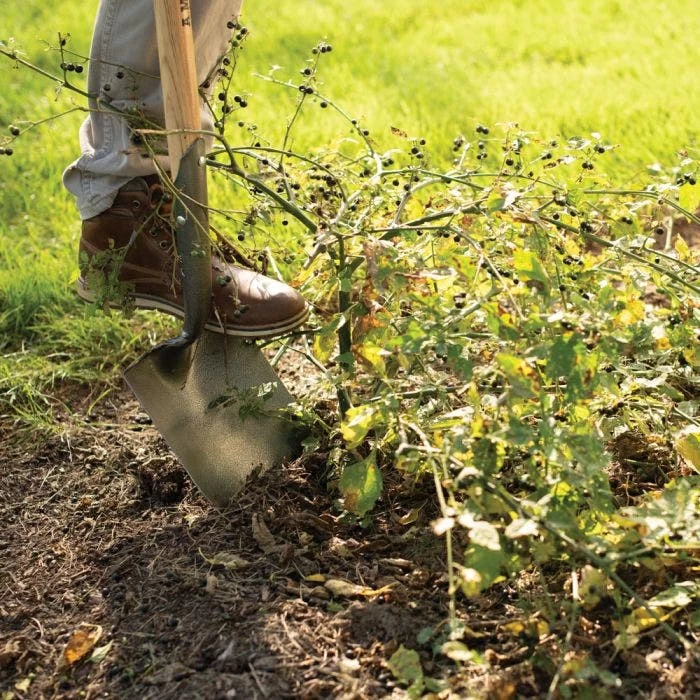 A.M. Leonard round-point blade pro shovel has a 48″ ash wood handle for comfort and a 12 gauge forged head for blade strength. This classic design of this head will not bend under use, and the forged back will not fill with dirt. The wood handle has grain that runs perpendicular to the shovel to allow for maximum leverage strength. Lifetime warranty.