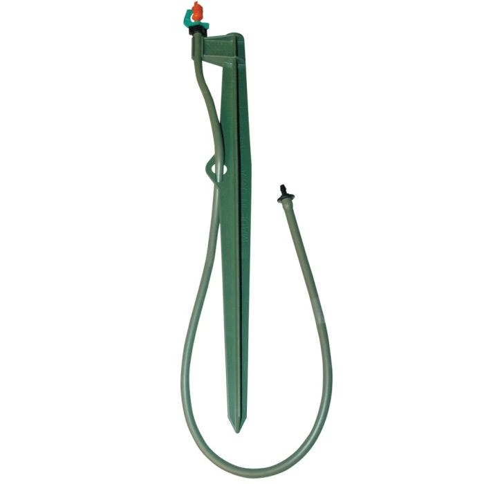 - Components: 13″ green clip stake, 25″ green vinyl micro tubing with barb fitting, and swap top nozzle jet