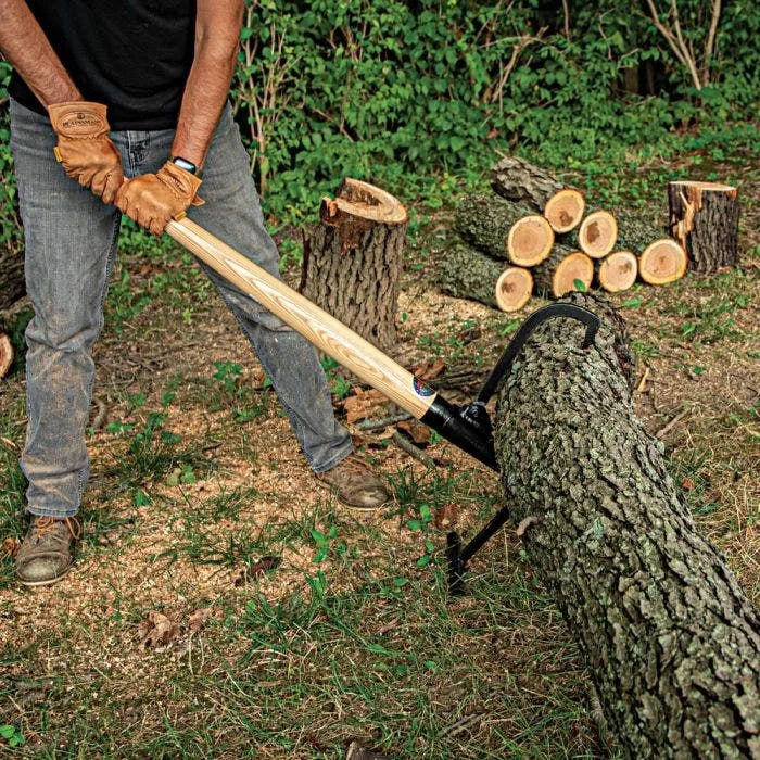 The timberjack fits one end of the log, lifting it from the ground and holding it securely in place, providing a clear cutting area. You will see increased productivity due to time saved from wrestling logs and less saw damage, pinching and kickback. 42″long w/ hardwood handle.