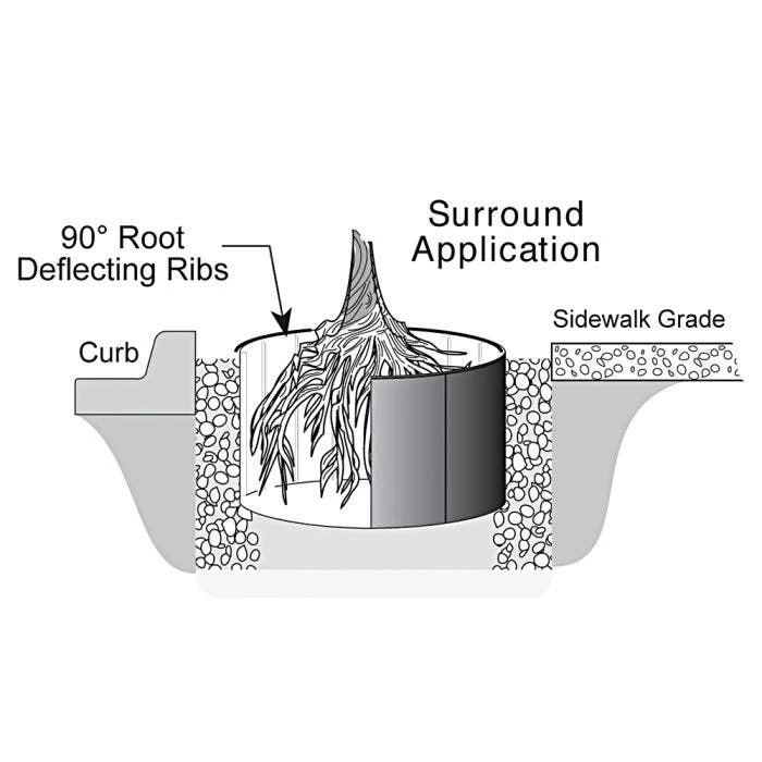 Flexible top safety edge for linear or surround applications. Raised root deflecting ribs. Interlocking panel design. These mechanical barriers redirect root growth downward. Border hardscapes to create a linear planting application, or connect to encircle the root ball for surround planting.