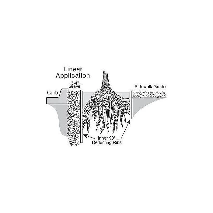 Black, molded, modular panels are made from 50% recycled polyethylene with ultraviolet inhibitors, and are .085-inch thick. Vertical 90° root-deflecting ribs appear every 6 inches and protrude 3/4 inch. Interlocking, anti-lift panels in two-foot long segments slide together to create various lengths of barrier. Each panel can be separated into 1 foot sections.