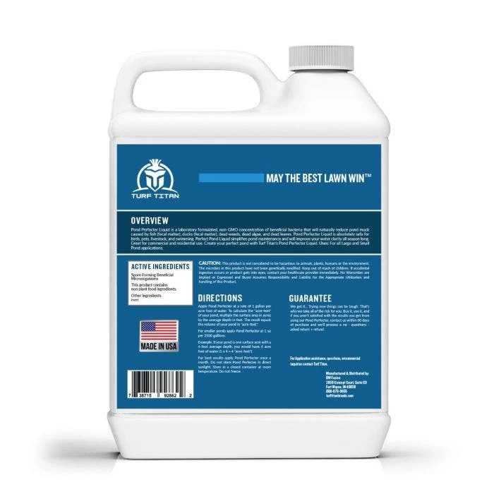 Turf Titan Pond Perfecter Perfect Pond Liquid is a laboratory formulated, non-GMO concentration of beneficial bacteria that naturally reduces pond muck caused by fish, ducks, dead weeds, dead algae, and leaves.